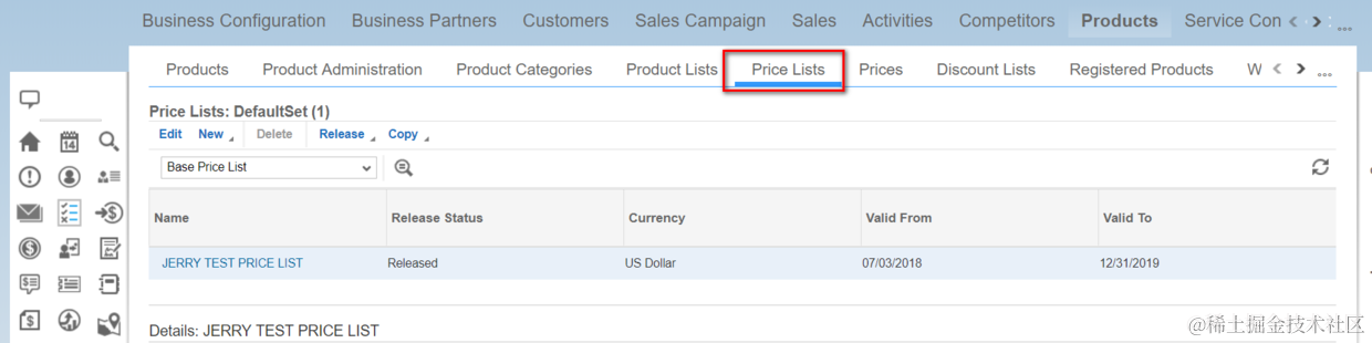 - Products工作中心,Price Lists视图,创建一个新的price list: