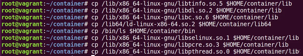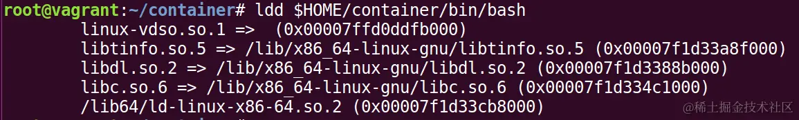 该命令为了查看需要有哪些库文件得手动拷贝到文件夹$/HOME/container/bin/bash下面:
