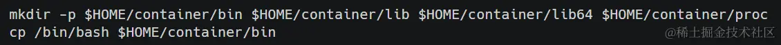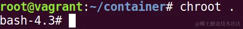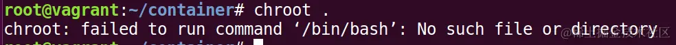 新建一个文件夹,执行chroot . 意思是把文件夹$HOME/container当作新建进程的根目录。但是没有成功,报错误消息chroot: failed to run command ‘/bin/bash’: No such file or directory