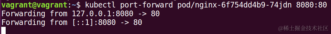 执行命令行 kubectl port-forward pod/nginx-6f754dd4b9-74jdn 8080:80