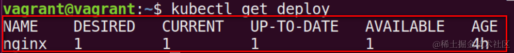 用kubectl get deploy查看成功生成的名为nginx的deployment: