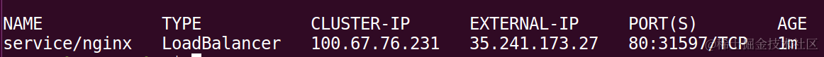执行完毕后,我们调用下面的命令行,看到了创建的service的Cluster IP和External IP。