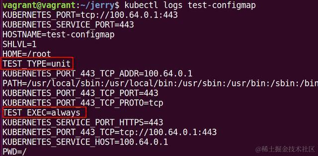 使用命令kubectl logs test-configmap查看这个pod运行生成的日志,发现输出的环境变量列表中,出现了TEST_TYPE=unit,这个TEST_TYPE是我在yaml文件里注入的环境变量名称,而unit就来自configmap里test-config的值unit。