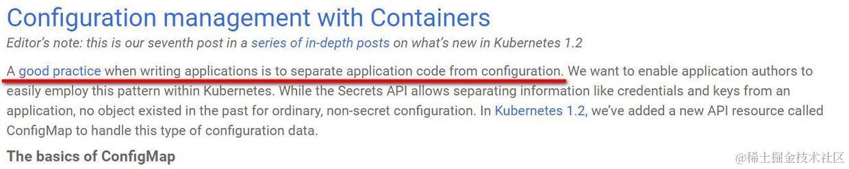 在Kubernetes官网里,有这样一篇文章,提到了Kubernetes里的一个最佳实践就是把应用代码同配置信息分开,一种方式就是使用Kubernetes 1.2里引入的configmap概念。