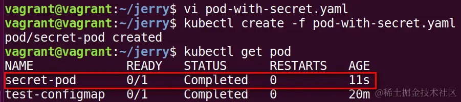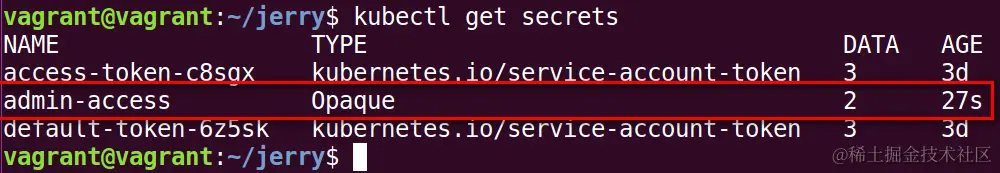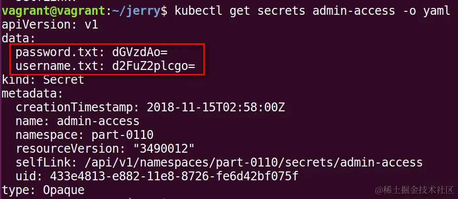 而我们刚刚创建的secret的类型为Opaque,因此在kubectl get secrets的返回结果里,能看到password和username的值均为base64编码:
