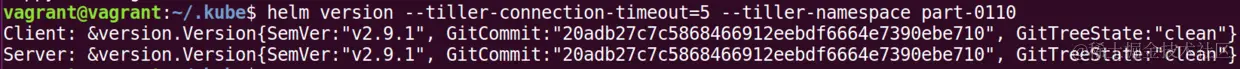 vagrant@vagrant:~/.kube$ helm version --tiller-connection-timeout=5 --tiller-namespace part-0110