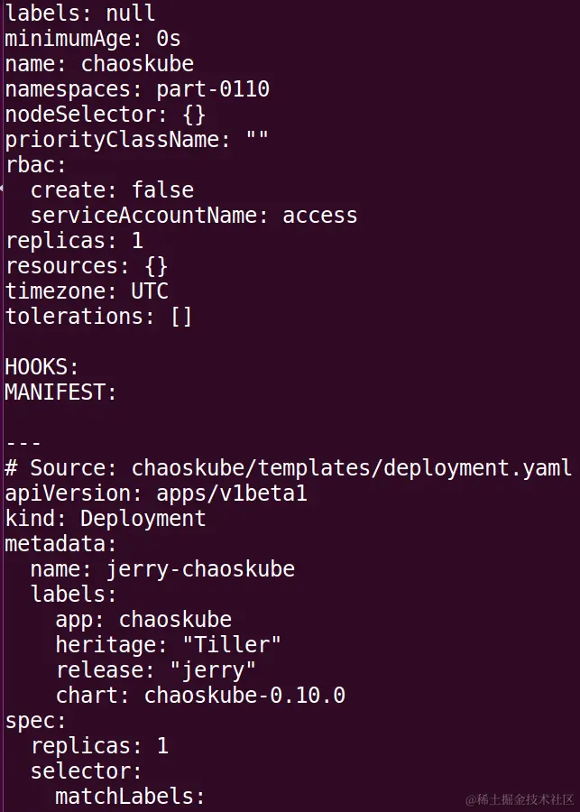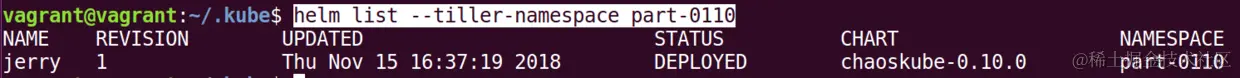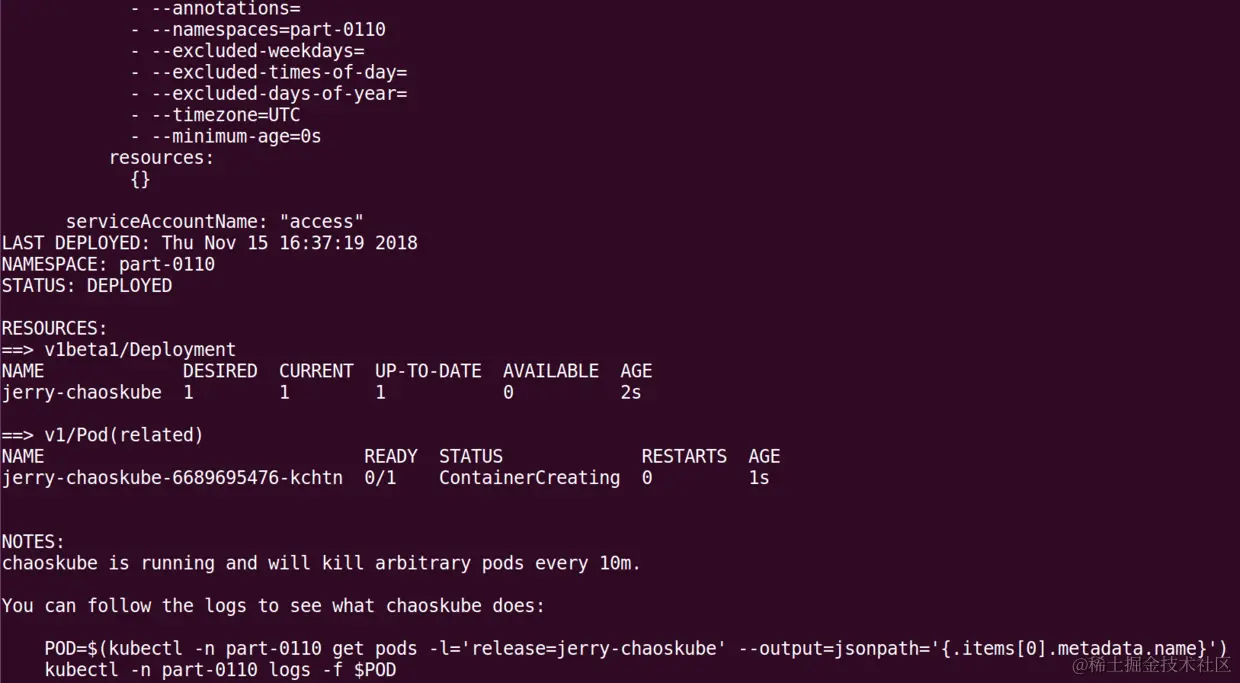vagrant@vagrant:~/.kube$ helm install --name jerry stable/chaoskube --set namespaces=part-0110 --set rbac.serviceAccountName=access --tiller-namespace part-0110 --debug