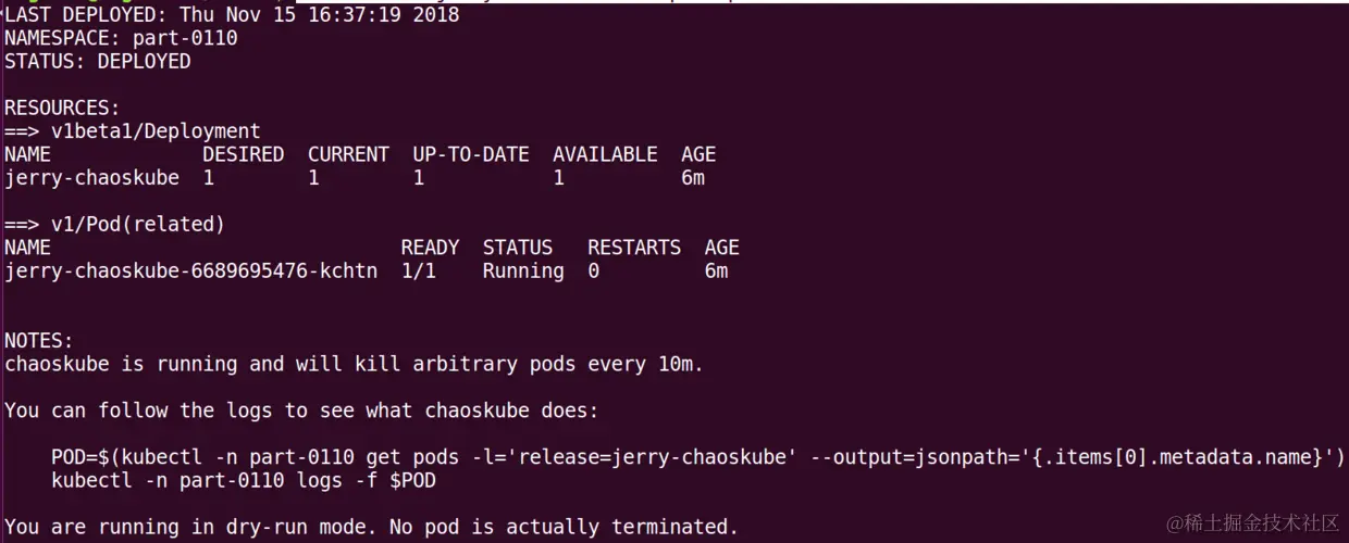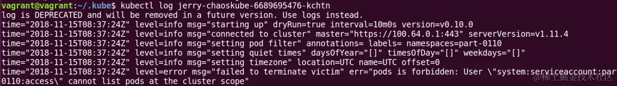 上图也显示了自动生成的pod名称为jerry-chaoskube-6689695476-kchtn,可以用kubectl log命令查看其运行日志:
