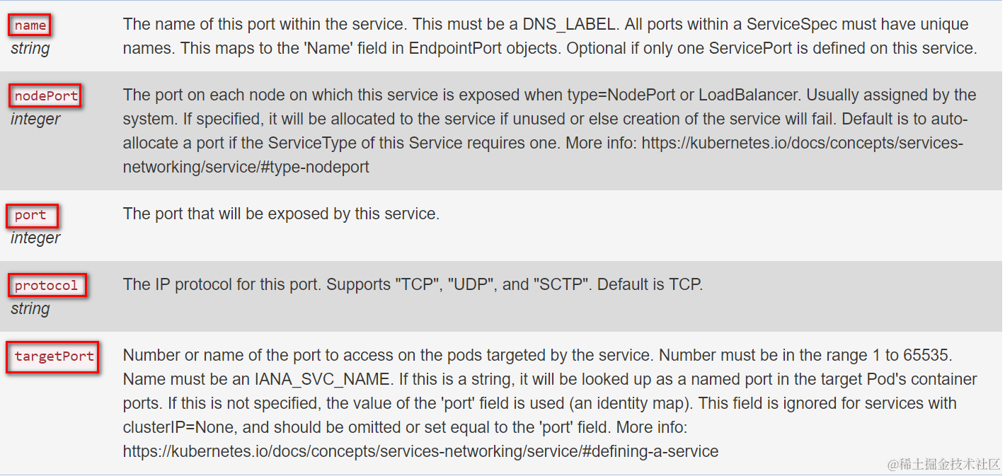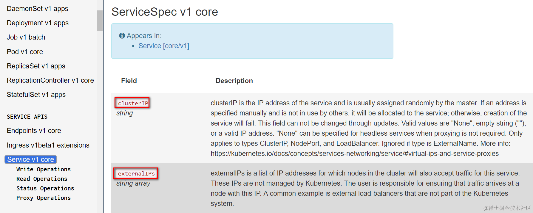 上述Service的yaml文件里每个字段,在Kubernetes的API文档里有详细说明。