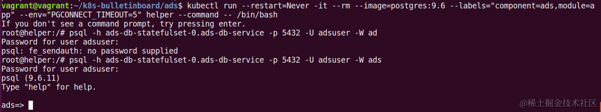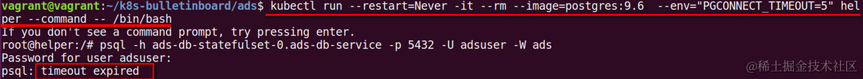 kubectl run --restart=Never -it --rm --image=postgres:9.6 --labels=“component=ads,module=app” --env=“PGCONNECT_TIMEOUT=5” helper --command – /bin/bash