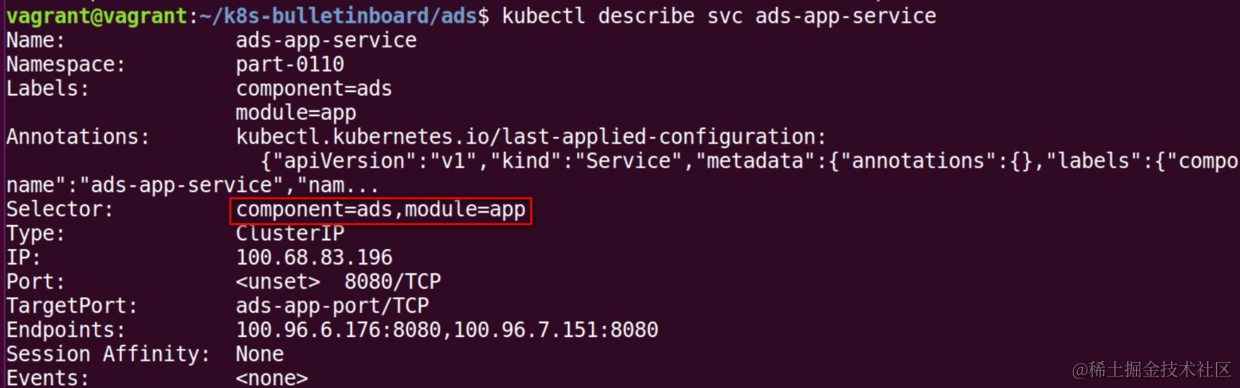 用kubectl create -f创建service,因为类型设置为ClusterIP,但没有指定具体的IP地址,因此创建时自动生成了一个。