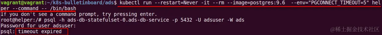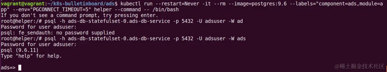 执行完毕后看到提示root@helper:/#, 说明我通过上述命令创建的临时pod成功的连接到了postgreSQL的pod上。