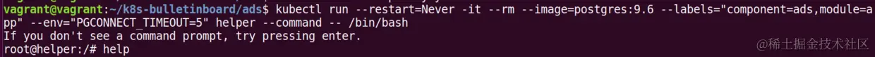 kubectl run --restart=Never -it --rm --image=postgres:9.6 --labels=“component=ads,module=app” --env=“PGCONNECT_TIMEOUT=5” helper --command – /bin/bash