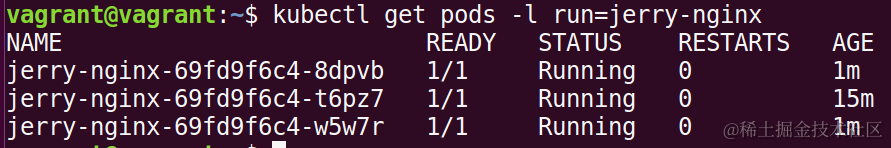 下图这个Age为15分钟之前的是第一次创建deployment时生成的,其他两个Age为1分钟之前的是执行了scale命令后自动创建的。