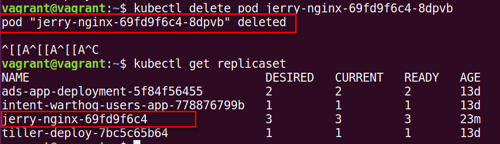 即使手动删除一个pod实例,replication set又会很快自动创建一个新的: