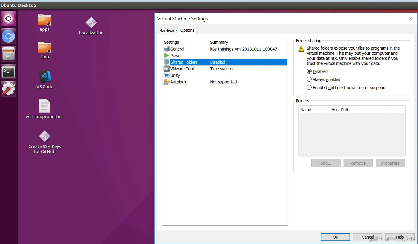 - Virtual Machine Settings->Share Folders, 将Disabled改为Always enabled: