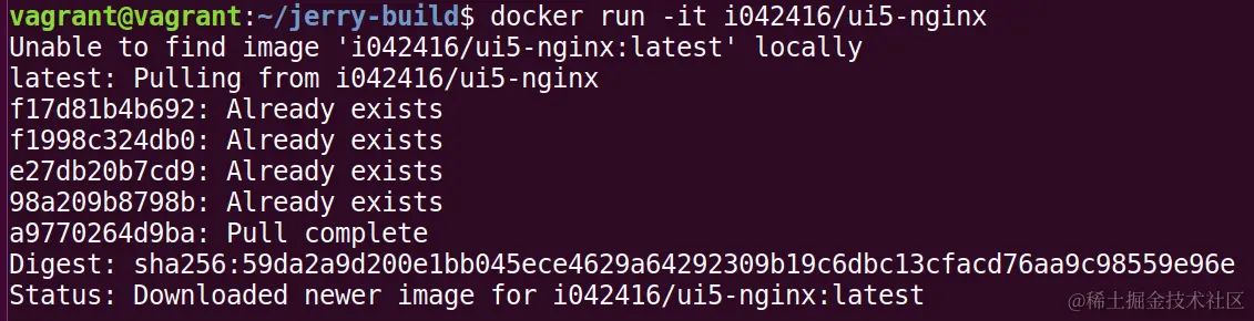 从输出能发现,因为本地镜像不存在,所以docker run 自动从docker hub上pull这个image: