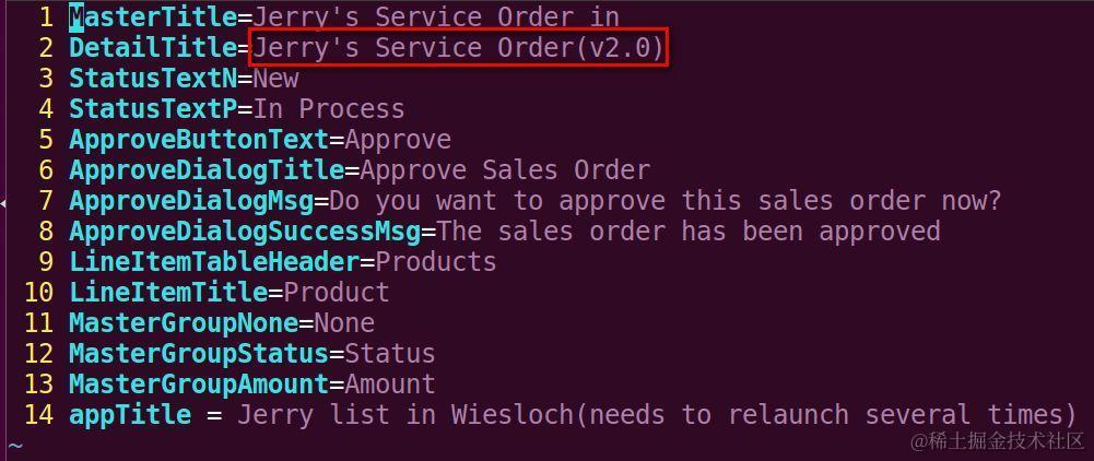 修改UI5应用明细页面的标题,在文字后加上一个**(v2.0)**, 用来表示这一版的应用为2.0版本: