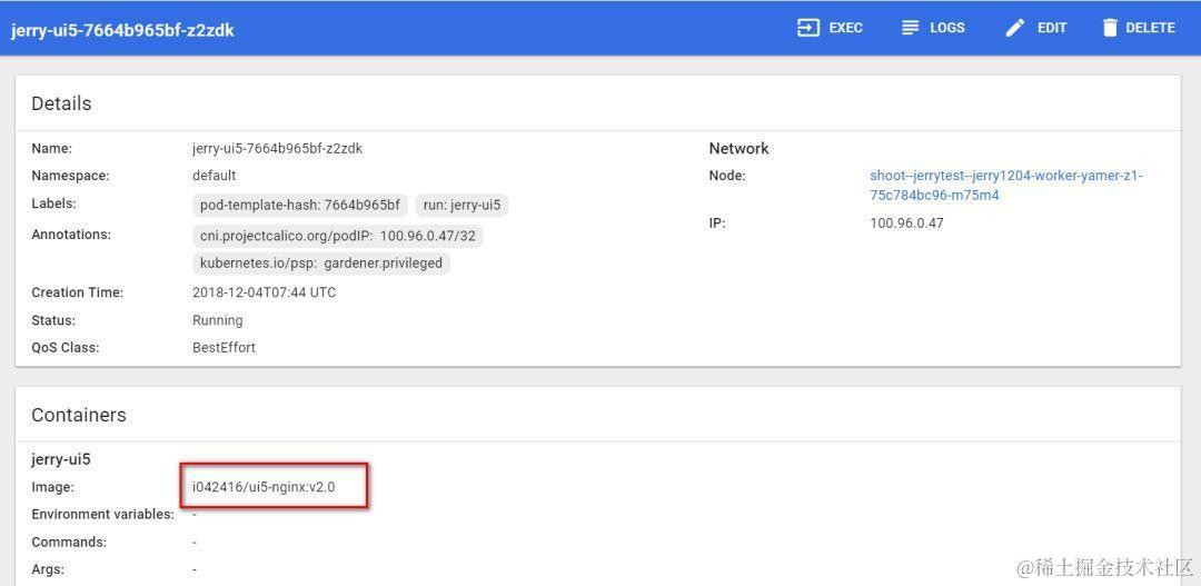 任意点开一个pod查看明细,发现其使用的docker镜像已经是v2.0版本了: