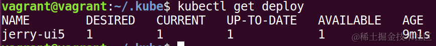 执行另一个命令kubectl get deploy,发现kubectl run命令除了生成一个pod外,还生成了一个deployment。从这个命令输出的Desired, Current和Up-to-Date, Available下面的数字,结合前面提到的Kubernetes里几乎所有的设计都是围绕着pod来展开这一指导思想,我们不难猜测出,这个生成的deployment也是为pod服务的。