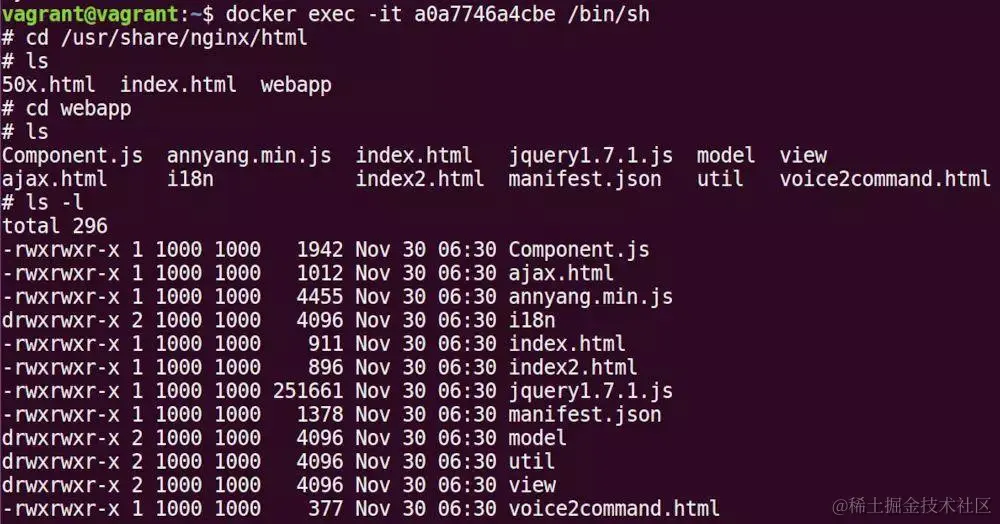 再次执行docker exec进入docker容器内部,确保**/usr/share/nginx/html**文件夹下确实包含了期望看到的UI5应用。