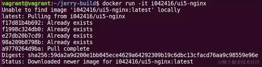 在两种情况下,由于本地镜像检索失败,我们都将看到提示信息:Unable to find image ‘i042416/ui5-nginx:latest’ locally, 然后观察到远端镜像的下载过程。
