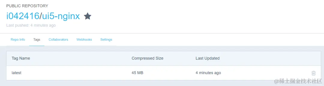 刷新Docker hub上新建的仓库,能观察到刚才的本地推送记录和镜像尺寸。