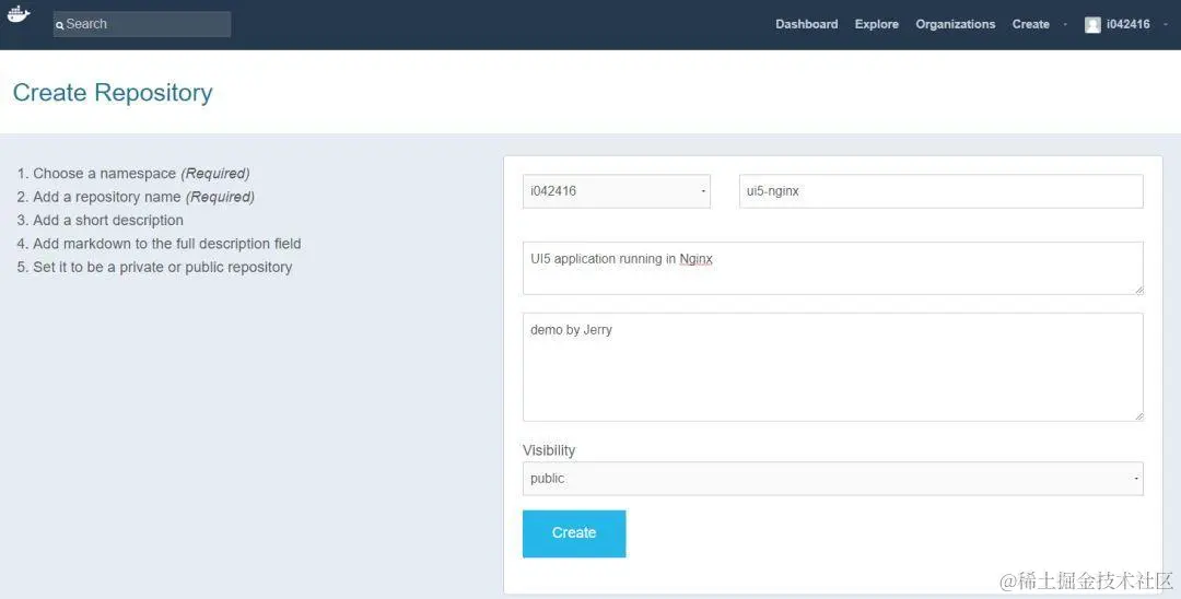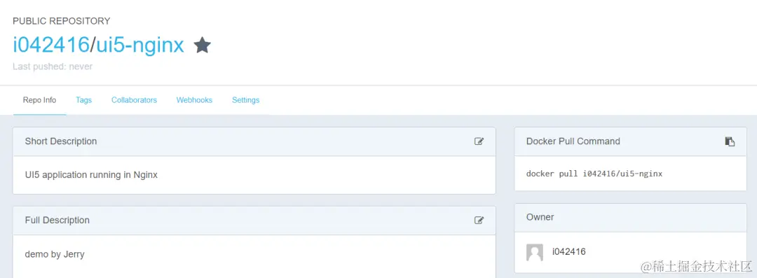 到目前为止这个本地docker实例是没有办法给其他人使用的,为此我们得先利用dockerfile制作一个包含了UI5应用的docker镜像,上传到docker hub上,以便其他人下载。