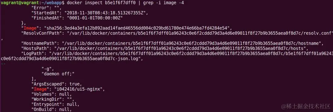 docker inspect命令证实了这个启动的容器确实是基于镜像i042416/ui5-nginx的。