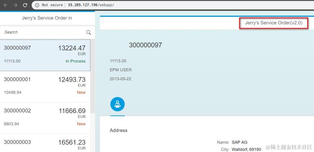 最后在浏览器里看到订单明细页面的标题,后面已经出现(v2.0), 再次确认了滚动升级已经成功结束了。