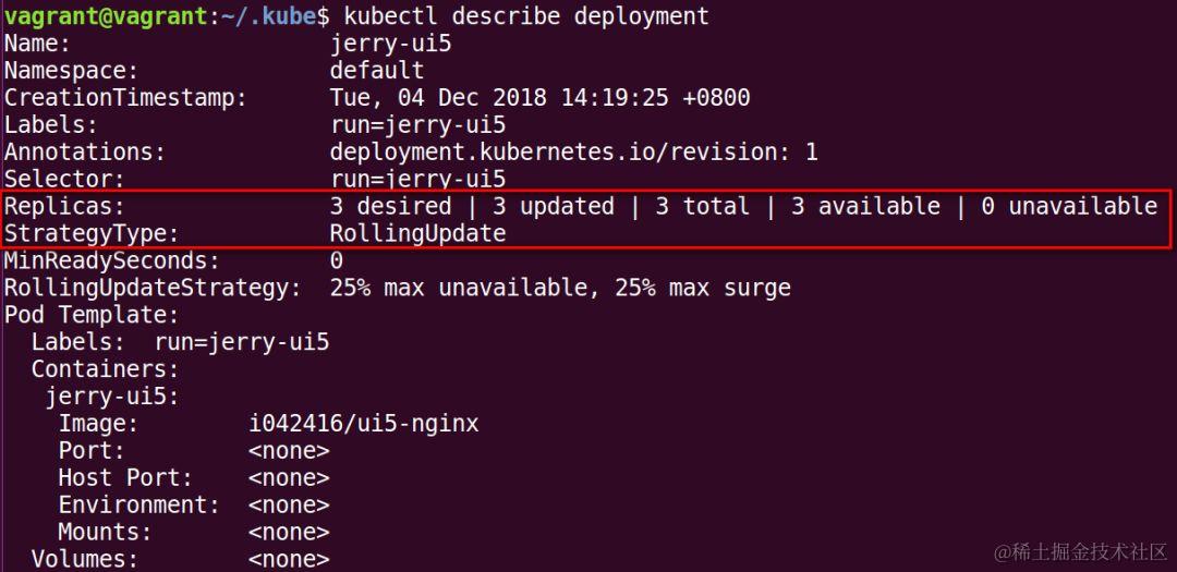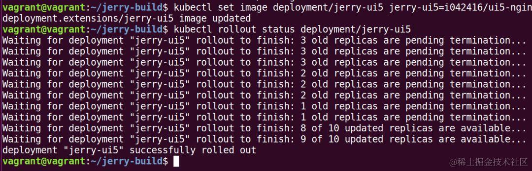 使用kubectl rollout status deployment/jerry-ui5查看滚动升级的实时进展情况。上图显示的日志表明,在某个时间点,有多少个旧版本的pod正等待被终止,有多少个新版本的pod已经处于可用状态。