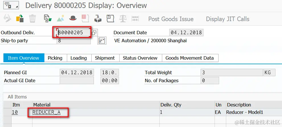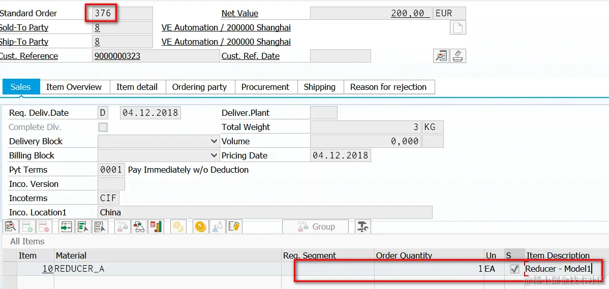 要在S/4HANA里创建Outbound Delivery,首先要具有一个销售订单,ID为376,通过事务码VA03查看。