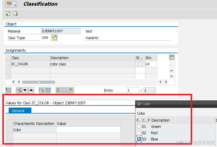 - 之后就能够使用tcode MM02为configurable material ZJERRY1007维护characteristic上的value: