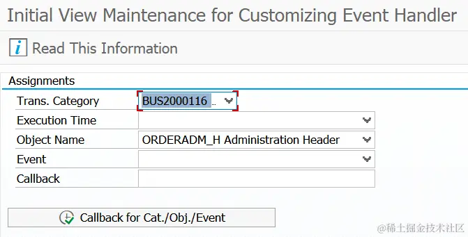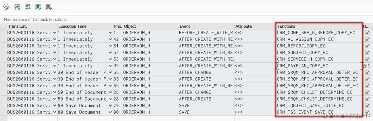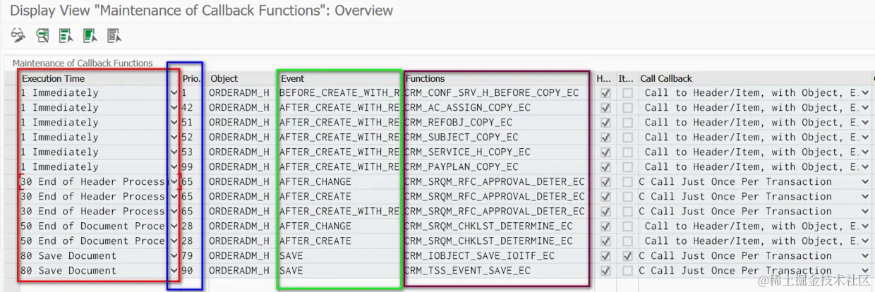 下图第一列红色的Execution Time,表示这些分配的函数到底是事件触发后立即执行,还是延迟到订单抬头或者行项目的通用例程执行完后再执行(往往用于实现批量操作,或者待执行函数同通用例程存在依赖关系,或者出于性能考虑)。