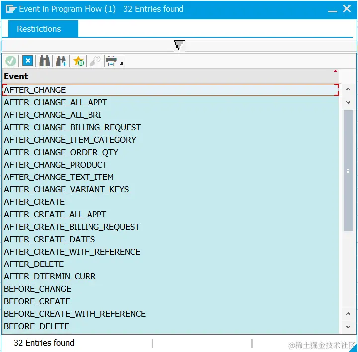 第三列Event,就是观察者-发布者模式里的事件了,下面是SAP CRM订单框架一些标准的事件: