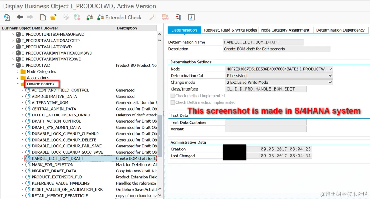 Partners可以在这些Hook里进行业务功能增强。有些Hook可能存在某些读写限制,比如AfterLoading这个Hook,会在SAP BO的标准加载逻辑执行完毕后被调用,在这个Hook的实现里,SAP不允许任何对BO节点标准字段的写操作,以避免Partners的增强对SAP标准流程可能带来的影响。有的顾问朋友可能会说,这些Hook不就是SAP Netweaver里传统的Business AddIn(BAdI)么?没错,概念上可以这么理解,需要提醒的就是,这些Hook创建之后,在ABAP后台并不是以BAdI Implementation的方式存储,而是以ESF2 Determination的方式存储,类似下图这种BOPF里的Determination: