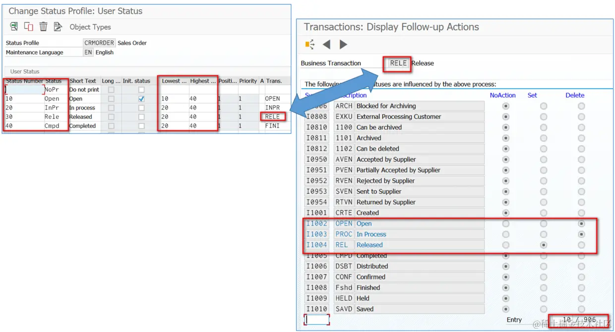 下图左边的Open, In process, Released和Completed就是用户自定义订单状态,SAP允许客户给每个状态分配一个Low和High的值,通过这种方式巧妙地提供了一种用非图形化方式进行状态跳转的定义。