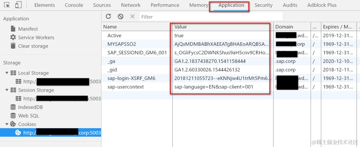 这些cookie信息能够在Chrome开发者工具的Application标签页里的Cookies区域查看: