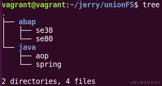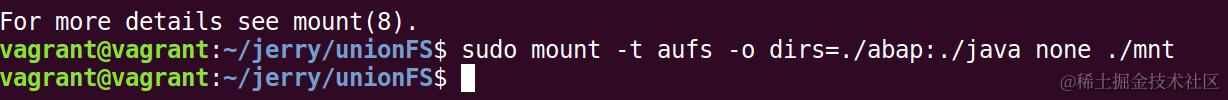 新建一个mnt文件夹,用mount命令把abap和java文件夹merge到mnt文件夹下,-t执行文件系统类型为aufs: