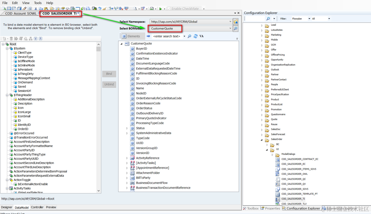 到cloud Application Studio的UI Designer里打开这个UI 模型,在Data model区域找到Business object的名称为CustomerQuote,这就有点怪了,我起初以为是Sales Order。