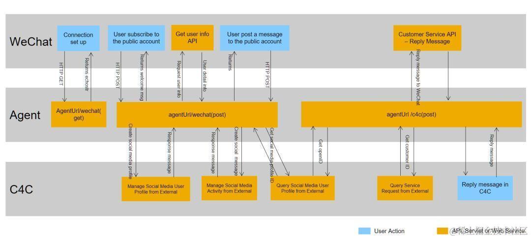 在C4S和Social Media集成的相关场景中,用户可以通过关注微信公众号来绑定一个特定的BusinessPartner(以下简称BP), 从而达到通过用户在系统中自定义的微信Channel来直接与C4C服务模块中的工作人员直接交互的目的。而Activity是针对指定的BP所进行的活动,例如创建ticket,点赞,回复等。故而完整的业务流程如下: