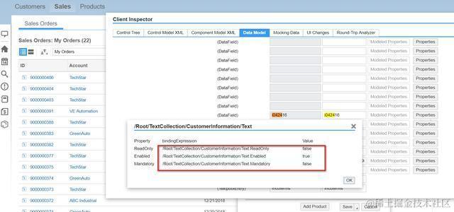首先进入调试模式,查看到这个字段绑定到UI模型的TextCollection/CustomerInformation上