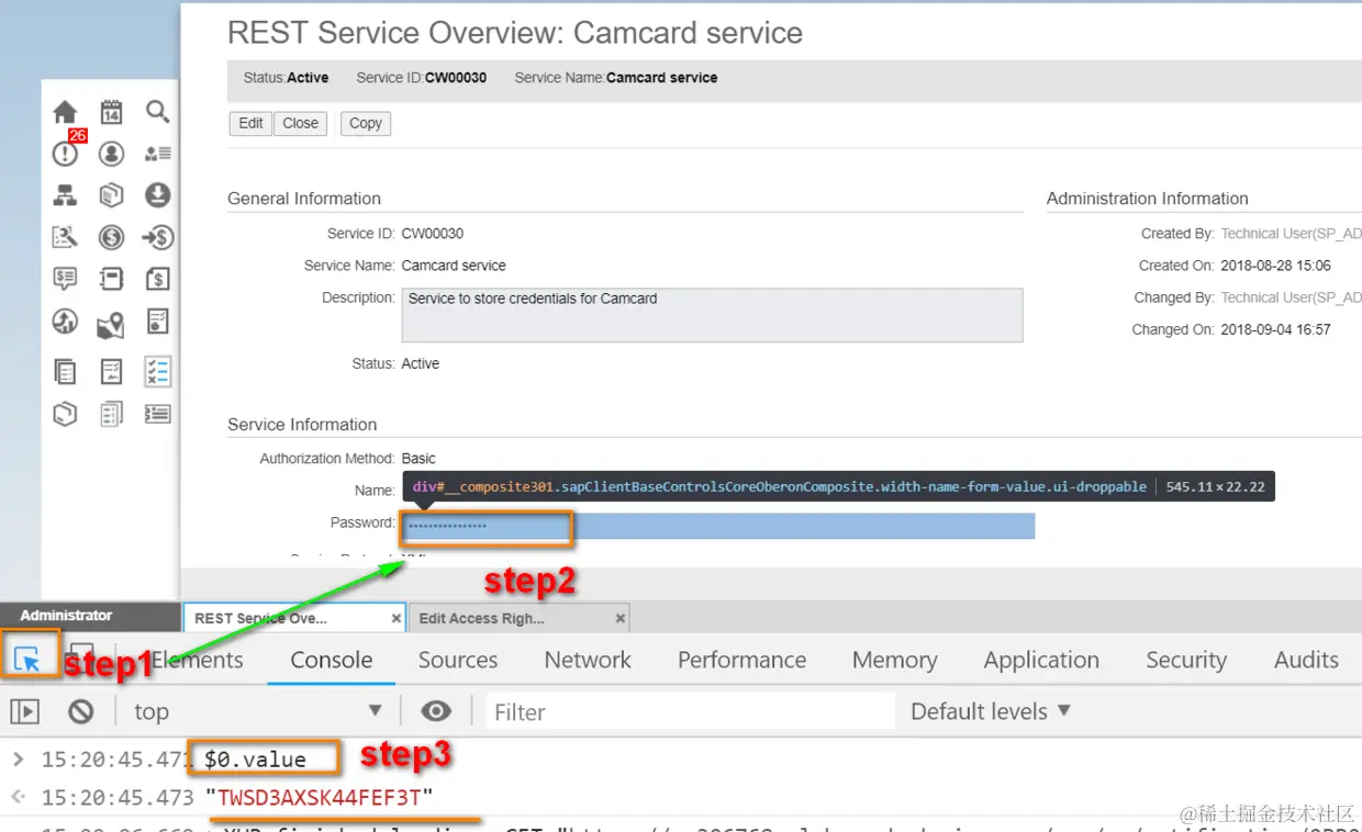 小技巧:浏览器里显示成星号的密码,忘记了该怎么办? 已注销 2021-04-23 200 阅读1分钟 比如下图这种,记性不好,忘记了密码该怎么办? 很简单,Chrome浏览器里按F12打开开发者工具,切换到Elements面板,点击下图Step1的图标,然后单击密码显示框,保持这个字段处于选中状态,然后切换到Console标签页,输入$0.value, 回车就能看到密码了。 要获取更多Jerry的原创文章,请关注公众号"汪子熙":