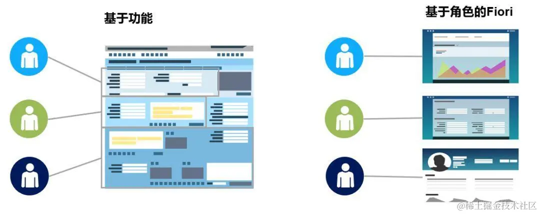 至简不仅仅意味着系统架构的简化,同时也包括业务流程的简化。在过去,每个业务人员需要面对繁杂的基于功能的应用界面,如下左图示例: