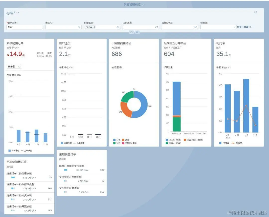 - 获取与您最相关的销售特定 KPI 的图形概览,例如,收到的销售订单、客户退货、不完整的销售凭证、延期交货订单、利润率、已冻结和逾期销售订单