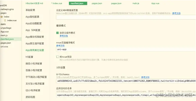 并在“App常用其他设置”中的“iOS设置”中填写URL Scheme,以及白名单等信息,具体每个平台如何配置,请参考 原生文档第4点配置Xcode项目这块。