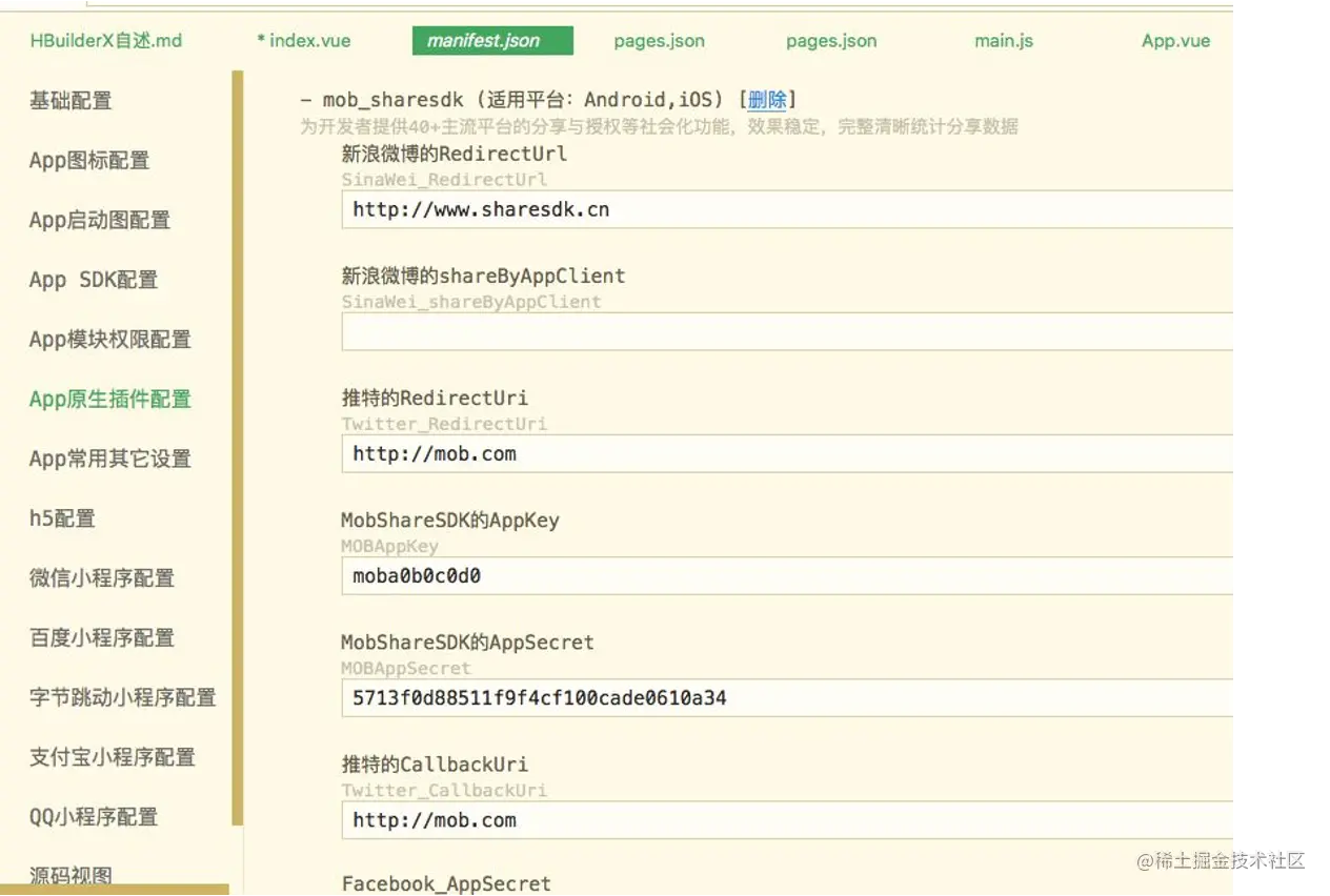 在“App原生插件配置”中添加MobTech平台注册的MOBAppKey和MOBAppSecret,如何得到这2个参数,请参考: