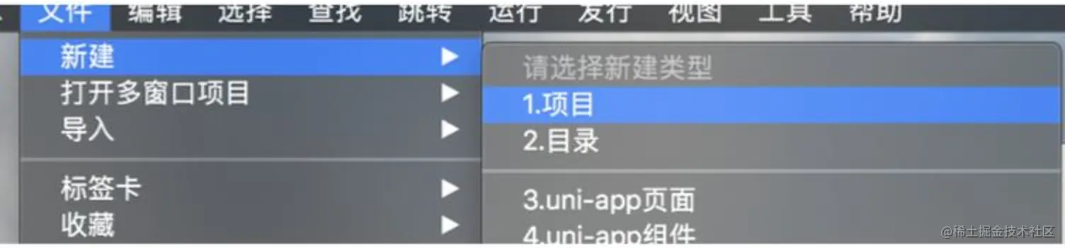 之后选择新建Uni-App项目。打开HBuildX的文件->导入->本地项目导入创建的文件夹->创建。