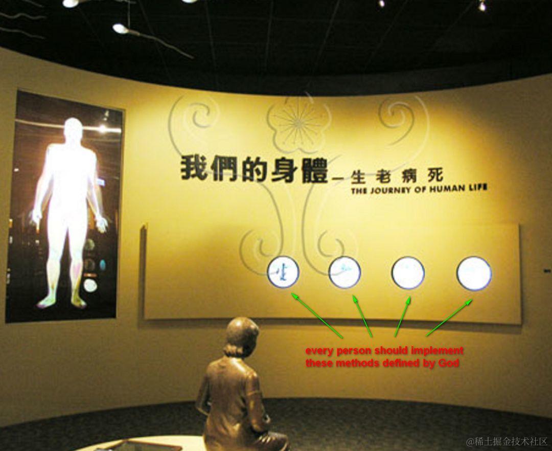 我们每个人被父母实例化出来之后,只能被动地实现上帝在模板里定义好的四个方法:生,老,病,死,而不能够更改这个模板本身,比如调换这四个方法的顺序。即使是乔布斯,也没有办法给自己添加一个"永生"的方法。听起来很残酷,但这是事实。