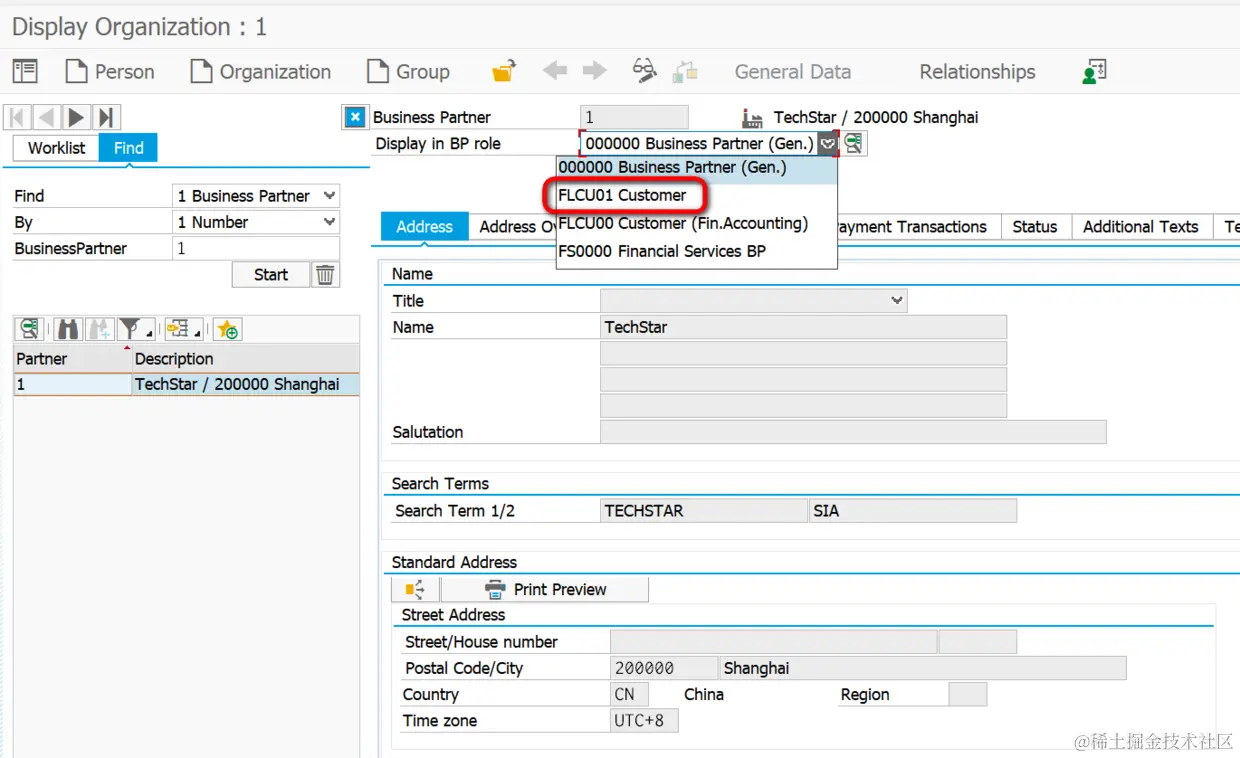 根据客户ID搜索之后,在明细页面里将Display in BP role的下拉菜单宣称FLCU01 Customer: